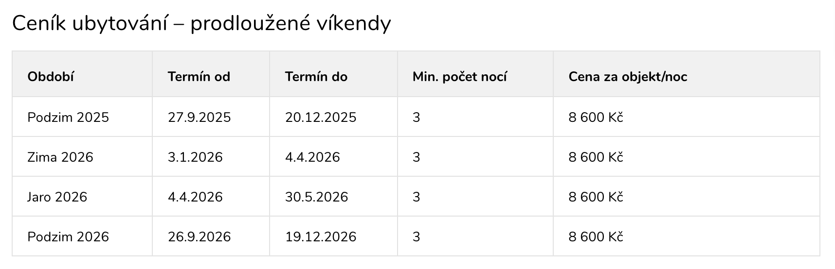 víkendové i jiné krátkodobé pobyty, ale pouze dle dohody mimo letní sezónu.